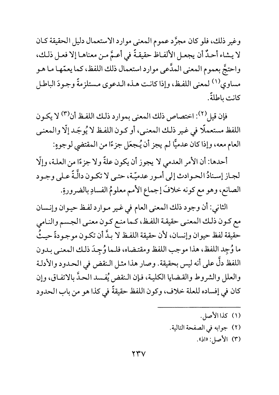 الثاني: أن وجود ذلك المعنى العام في غير موارد لفظ حيوان وإنسان مع كون ذلك المعنى حقيقة اللفظ، كما منع كون معنى الجسم والنامي حقيقة لفظ حيوان وإنسان، لأن حقيقة اللفظ لا بدَّ أن تكون موجودةً حيثُ ما وُجِد اللفظ، هذا موجب اللفظ ومقتضاه، فلما وُجِدَ ذلك المعنى بدون اللفظ دلَّ على أنه ليس بحقيقة. وصار هذا مثل النقض في الحدود والأدلة والعلل والشروط والقضايا الكلية، فإن النقض يُفسد الحدَّ بالاتفاق، وإن كان في إفساده للعلة خلاف، وكون اللفظ حقيقةً في كذا هو من باب الحدود