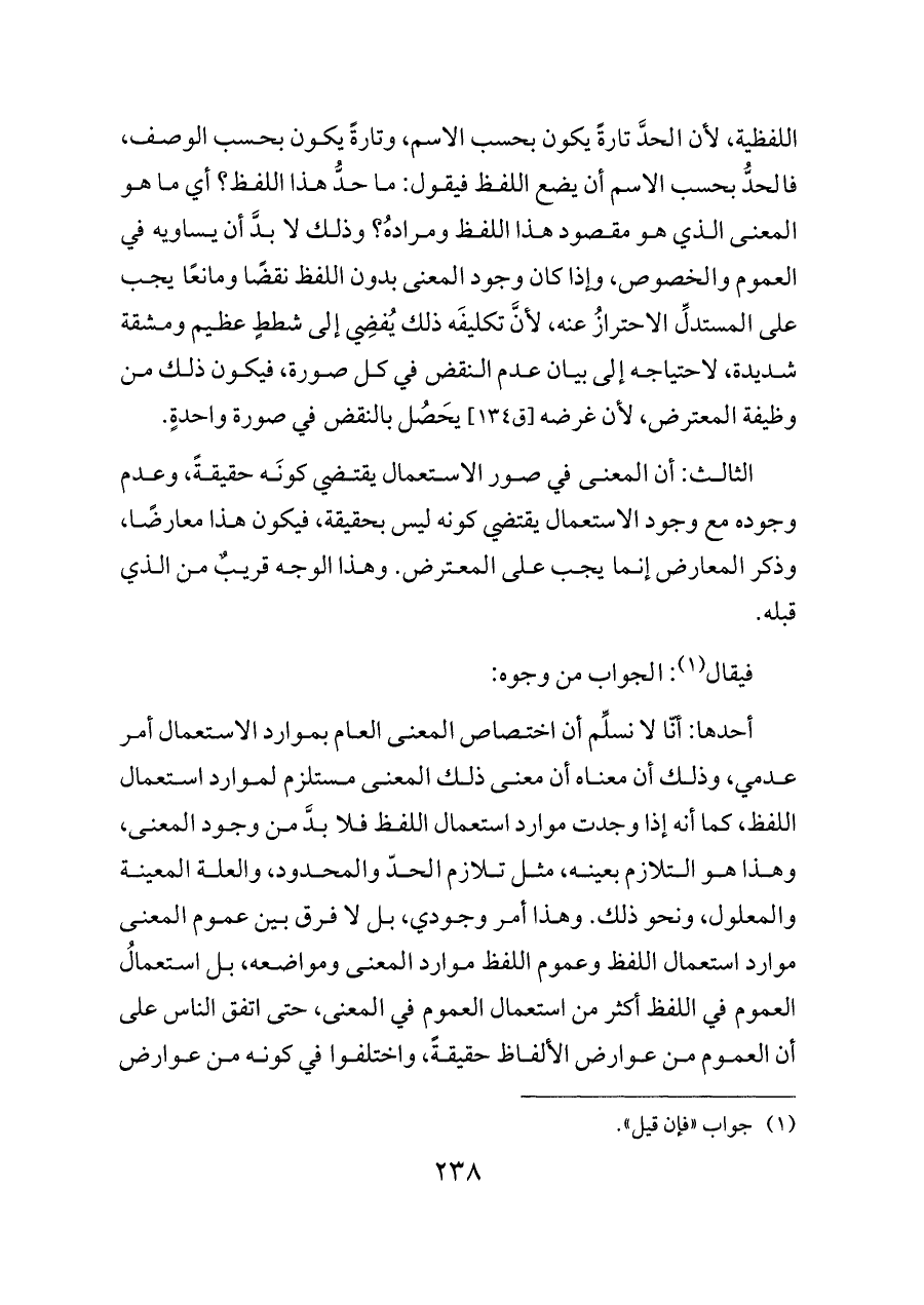 أحدها: أنّا لا نسلِّم أن اختصاص المعنى العام بموارد الاستعمال أمر عدمي، وذلك أن معناه أن معنى ذلك المعنى مستلزم لموارد استعمال اللفظ، كما أنه إذا وجدت موارد استعمال اللفظ فلا بدَّ من وجود المعنى، وهذا هو التلازم بعينه، مثل تلازم الحدّ والمحدود، والعلة المعينة والمعلول، ونحو ذلك. وهذا أمر وجودي، بل لا فرق بين عموم المعنى موارد استعمال اللفظ وعموم اللفظ موارد المعنى ومواضعه، بل استعمالُ العموم في اللفظ أكثر من استعمال العموم في المعنى، حتى اتفق الناس على أن العموم من عوارض الألفاظ حقيقةً، واختلفوا في كونه من عوارض