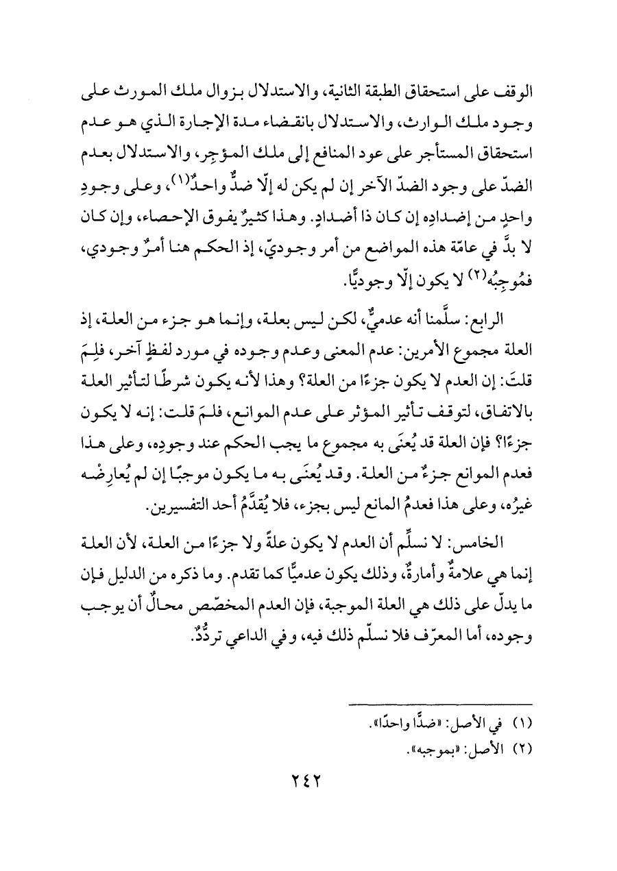 الوقف على استحقاق الطبقة الثانية، والاستدلال بزوال ملك المورث على وجود ملك الوارث، والاستدلال بانقضاء مدة الإجارة الذي هو عدم استحقاق المستأجر على عود المنافع إلى ملك المؤجِر، والاستدلال بعدم الضدّ على وجود الضدّ الآخر إن لم يكن له إلّا ضدٌّ واحدٌ (¬١)، وعلى وجودِ واحدٍ من إضدادِه إن كان ذا أضدادٍ. وهذا كثيرٌ يفوق الإحصاء، وإن كان لا بدَّ في عامّة هذه المواضع من أمر وجوديّ، إذ الحكم هنا أمرٌ وجودي، فمُوجِبُه (¬٢) لا يكون إلّا وجوديًّا.