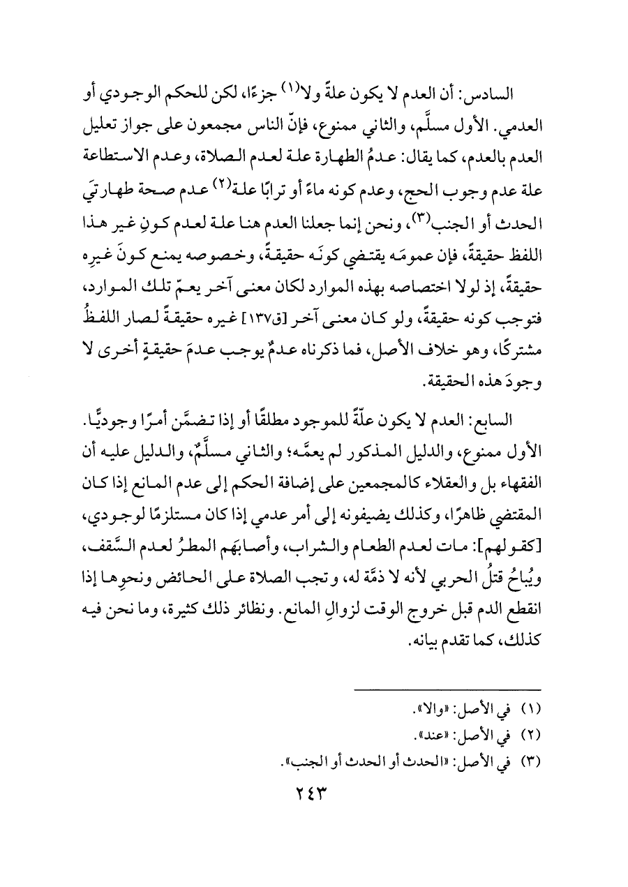 السابع: العدم لا يكون علّةً للموجود مطلقًا أو إذا تضمَّن أمرًا وجوديًّا. الأول ممنوع، والدليل المذكور لم يعمَّه؛ والثاني مسلَّمٌ، والدليل عليه أن الفقهاء بل والعقلاء كالمجمعين على إضافة الحكم إلى عدم المانع إذا كان المقتضي ظاهرًا، وكذلك يضيفونه إلى أمر عدمي إذا كان مستلزمًا لوجودي، [كقولهم]: مات لعدم الطعام والشراب، وأصابَهم المطرُ لعدم السَّقف، ويُباحُ قتلُ الحربي لأنه لا ذمَّة له، وتجب الصلاة على الحائض ونحوِها إذا انقطع الدم قبل خروج الوقت لزوالِ المانع. ونظائر ذلك كثيرة، وما نحن فيه كذلك، كما تقدم بيانه.
