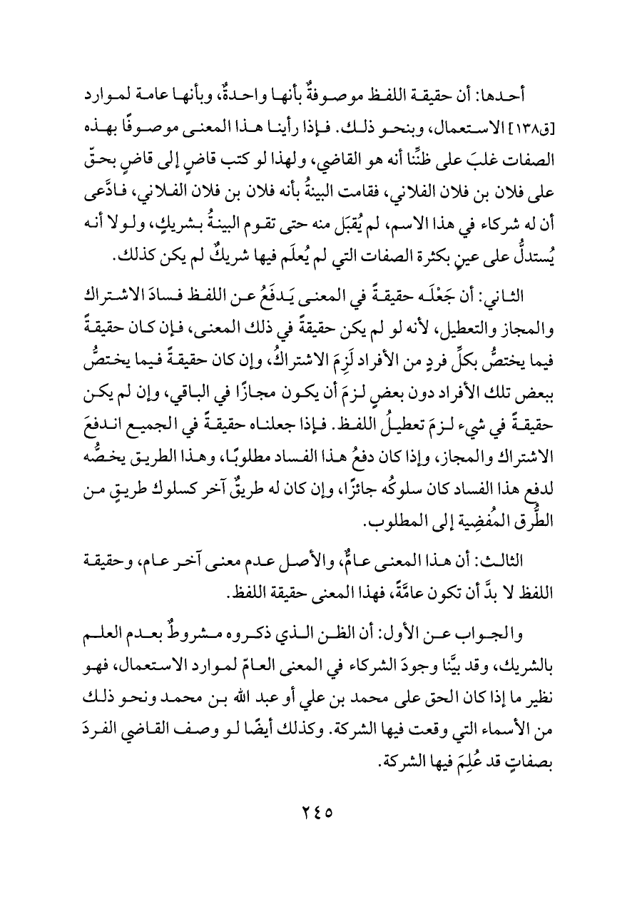 والجواب عن الأول: أن الظن الذي ذكروه مشروطٌ بعدم العلم بالشريك، وقد بيَّنا وجودَ الشركاء في المعنى العامّ لموارد الاستعمال، فهو نظير ما إذا كان الحق على محمد بن علي أو عبد الله بن محمد ونحو ذلك من الأسماء التي وقعت فيها الشركة. وكذلك أيضًا لو وصف القاضي الفردَ بصفاتٍ قد عُلِمَ فيها الشركة.