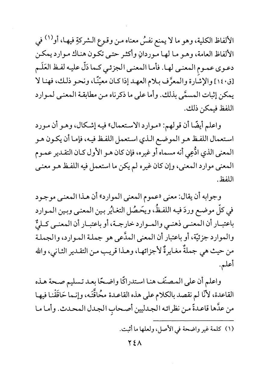 واعلم أيضًا أن قولهم: «موارد الاستعمال» فيه إشكال، وهو أن مورد استعمال اللفظ هو الموضع الذي استعمل اللفظ فيه، فإما أن يكون هو المعنى الذي ادُّعِي أنه مسماه أو غيره، فإن كان هو الأول كان التقدير عموم المعنى موارد المعنى، وإن كان غيره لم يكن ما استعمل فيه اللفظ هو معنى اللفظ.