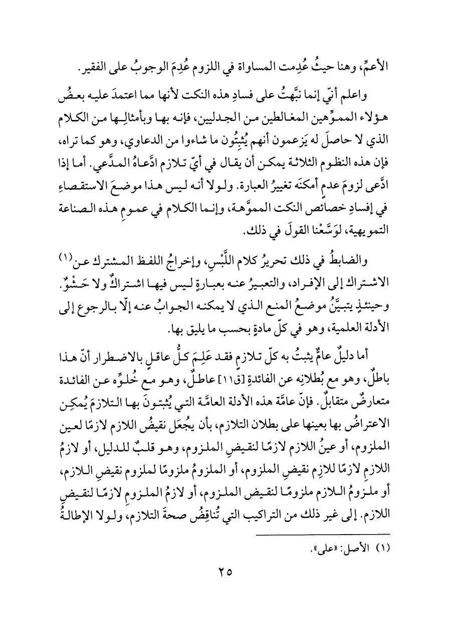 واعلم أنّي إنما نبَّهتُ على فسادِ هذه النكت لأنها مما اعتمدَ عليه بعضُ هؤلاء المموِّهين المغالطين من الجدليين، فإنه بها وبأمثالِها من الكلام الذي لا حاصلَ له يَزعمون أنهم يُثبِتُون ما شاءوا من الدعاوي، وهو كما تراه، فإن هذه النظوم الثلاثة يمكن أن يقال في أيّ تلازم ادَّعاهُ المدَّعي. أما إذا ادَّعى لزومَ عدمٍ أمكنَه تغييرُ العبارة. ولولا أنه ليس هذا موضعَ الاستقصاءِ في إفسادِ خصائص النكت المموَّهة، وإنما الكلام في عمومِ هذه الصناعة التمويهية، لوَسَّعْنا القولَ في ذلك.