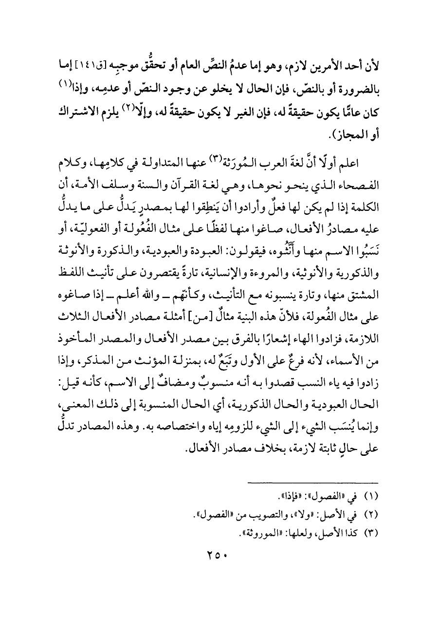 اعلم أولًا أنَّ لغةَ العرب المُورَثة (¬٣) عنها المتداولة في كلامِها، وكلام الفصحاء الذي ينحو نحوها، وهي لغة القرآن والسنة وسلف الأمة، أن الكلمة إذا لم يكن لها فعلٌ وأرادوا أن يَنطِقوا لها بمصدرٍ يَدلُّ على ما يدلُّ عليه مصادرُ الأفعال، صاغوا منها لفظًا على مثال الفُعُولة أو الفعوليّة، أو نَسَبُوا الاسم منها وأَنَّثُوه، فيقولون: العبودة والعبودية، والذكورة والأنوثة والذكورية والأنوثية، والمروءة والإنسانية، تارةً يقتصرون على تأنيث اللفظ المشتق منها، وتارة ينسبونه مع التأنيث، وكأنّهم ــ والله أعلم ــ إذا صاغوه على مثال الفُعولة، فلأنّ هذه البنية مثالٌ [من] أمثلة مصادر الأفعال الثلاث اللازمة، فزادوا الهاء إشعارًا بالفرق بين مصدر الأفعال والمصدر المأخوذ من الأسماء، لأنه فرعٌ على الأول وتَبَعٌ له، بمنزلة المؤنث من المذكر، وإذا زادوا فيه ياء النسب قصدوا به أنه منسوبٌ ومضافٌ إلى الاسم، كأنه قيل: الحال العبودية والحال الذكورية، أي الحال المنسوبة إلى ذلك المعنى، وإنما يُنسَب الشيء إلى الشيء للزومِه إياه واختصاصه به. وهذه المصادر تدلُّ على حالٍ ثابتة لازمة، بخلاف مصادر الأفعال.