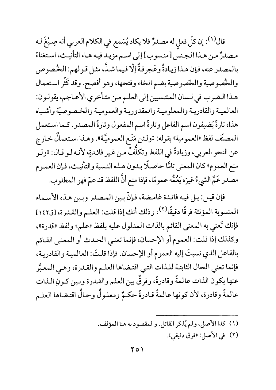 قال (¬١): إن كلّ فعلٍ له مصدرٌ فلا يكاد يُسَمع في الكلام العربي أنه صِيْغَ له مصدرٌ من هذا الجنس [منسوب] إلى اسم مزيد فيه هاء التأنيث، استغناءً بالمصدر عنه، فإن هذا زيادةٌ وعَجرفةٌ إلّا فيما شذَّ، مثل قولهم: الخُصوص والخُصوصية والخَصوصية بضم الخاء وفتحها، وهو أفصح. وقد كَثُر استعمال هذا الضرب في لسان المنتسبين إلى العلم من متأخري الأعاجم، يقولون: العالمية والقادرية والمعلومية والمقدورية والعمومية والخصوصيّة وأشباه هذا، تارةً يَضيفون اسم الفاعل وتارةً اسم المفعول وتارةً المصدر. كما استعمل المصنّف لفظ «العمومية» بقوله: «ولئن مَنَع العموميَّة». وهذا استعمالٌ خارج عن النحو العربي، وزيادةٌ في اللفظ وتكلُّفٌ من غير فائدةٍ، لأنه لو قال: «ولو منع العموم» كان المعنى تامًّا حاصلًا بدون هذه النسبة والتأنيث، فإن العموم مصدر عَمَّ الشيءُ غيرَه يَعُمُّه عمومًا، فإذا منع أنَّ اللفظ قد عمّ فهو المطلوب.