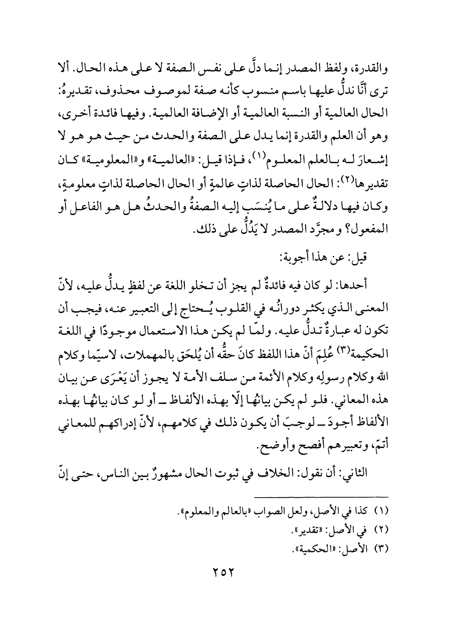 والقدرة، وهي المعبَّر عنها بكون الذات عالمةً وقادرةً، وفرقٌ بين العلم والقدرة وبين كونِ الذات عالمةً وقادرة، لأن كونها عالمةً قادرةً حكمٌ ومعلولٌ وحالٌ اقتضاها العلم والقدرة، ولفظ المصدر إنما دلَّ على نفس الصفة لا على هذه الحال. ألا ترى أنَّا ندلُّ عليها باسم منسوب كأنه صفة لموصوف محذوف، تقديرهُ: الحال العالمية أو النسبة العالمية أو الإضافة العالمية. وفيها فائدة أخرى، وهو أن العلم والقدرة إنما يدل على الصفة والحدث من حيث هو هو لا إشعارَ له بالعلم المعلوم (¬١)، فإذا قيل: «العالمية» و «المعلومية» كان تقديرها (¬٢): الحال الحاصلة لذاتٍ عالمةٍ أو الحال الحاصلة لذاتٍ معلومةٍ، وكان فيها دلالةٌ على ما يُنسَب إليه الصفةُ والحدثُ هل هو الفاعل أو المفعول؟ ومجرَّد المصدر لا يَدُلُّ على ذلك.