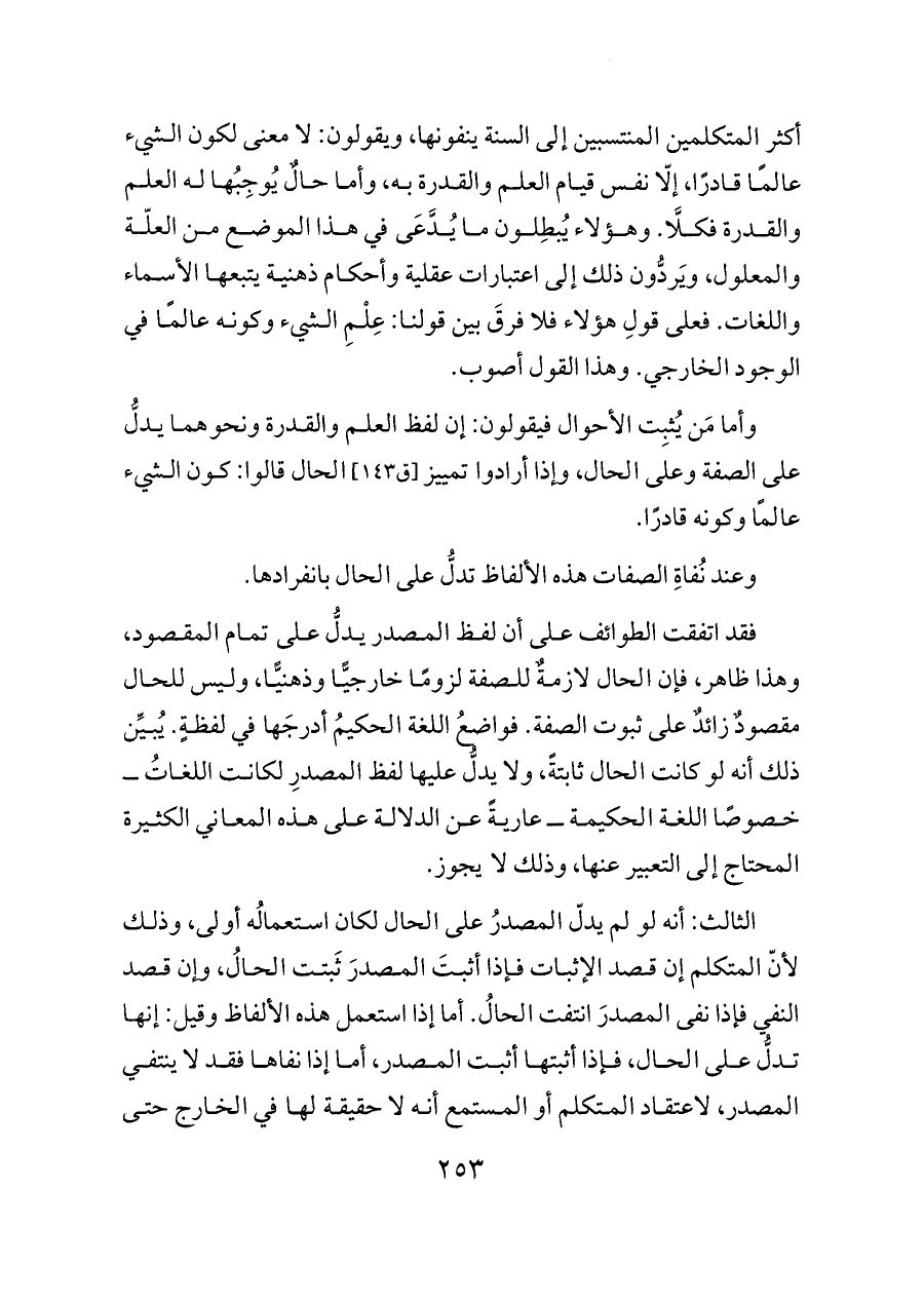 أكثر المتكلمين المنتسبين إلى السنة ينفونها، ويقولون: لا معنى لكون الشيء عالمًا قادرًا، إلّا نفس قيام العلم والقدرة به، وأما حالٌ يُوجِبُها له العلم والقدرة فكلَّا. وهؤلاء يُبطِلون ما يُدَّعَى في هذا الموضع من العلّة والمعلول، ويَردُّون ذلك إلى اعتبارات عقلية وأحكام ذهنية يتبعها الأسماء واللغات. فعلى قولِ هؤلاء فلا فرقَ بين قولنا: عِلْمِ الشيء وكونه عالمًا في الوجود الخارجي. وهذا القول أصوب.