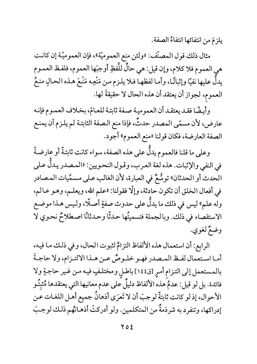 وعلى ما قلنا فالعموم يدلُّ على هذه الصفة، سواء كانت ثابتةً أو عارضةً في النفي والإثبات. هذه لغة العرب، وقول النحويين: «المصدر يدلُّ على الحدث أو الحدثان» توسُّعٌ في العبارة، لأن الغالب على مسمَّيات المصادر في أفعال الخلق أن تكون حادثة، وإلّا فقولنا: «علم الله، ويعلم، وهو عالم، وله علم» ليس في ذلك ما يدلُّ على حدوث صفةٍ أصلًا، وليس هذا موضع الاستقصاء في ذلك. وبالجملة فتسميتُها حدثًا وحدثانًا اصطلاحٌ نحوي لا وضعٌ لغوي.