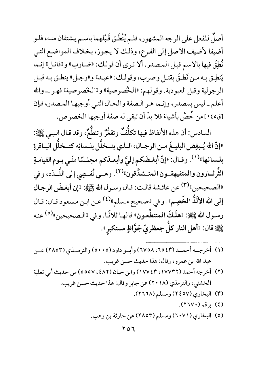 السادس: أن هذه الألفاظ فيها تكلُّفٌ وتقعُّرٌ وتنطُّعٌ، وقد قال النبي - صلى الله عليه وسلم -: «إنّ الله يُبغِض البليغَ من الرجال، الذي يتخلَّل بلسانِه كتخلُّل الباقرةِ بلسانها» (¬١). وقال: «إنّ أبغضَكم إليَّ وأبعدَكم مجلسًا منّي يوم القيامةِ الثَّرثارون والمتفيهقون المتشدِّقون» (¬٢). وهي تُفضِي إلى اللَّدَد، وفي «الصحيحين» (¬٣) عن عائشة قالت: قال رسول الله - صلى الله عليه وسلم -: «إن أبغضَ الرجال إلى الله الألَدُّ الخَصِم». وفي «صحيح مسلم» (¬٤) عن ابن مسعود قال: قال رسول الله - صلى الله عليه وسلم -: «هلَكَ المتنطِّعون» قالها ثلاثًا. وفي «الصحيحين» (¬٥) عنه - صلى الله عليه وسلم - قال: «أهل النار كلُّ جعظريّ جَوَّاظٍ مستكبرٍ».