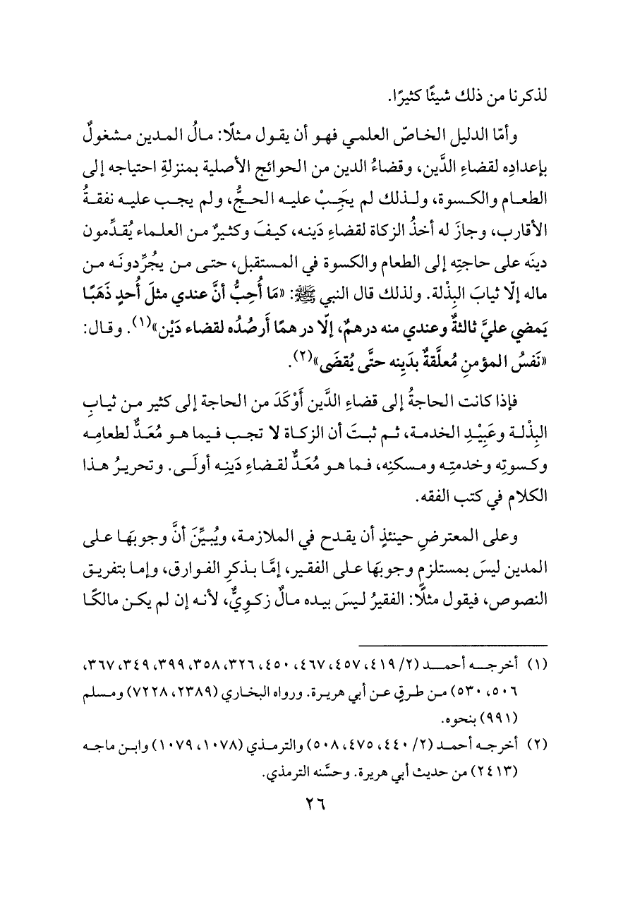 وأمّا الدليل الخاصّ العلمي فهو أن يقول مثلًا: مالُ المدين مشغولٌ بإعدادِه لقضاءِ الدَّين، وقضاءُ الدين من الحوائج الأصلية بمنزلةِ احتياجه إلى الطعام والكسوة، ولذلك لم يَجِبْ عليه الحجُّ، ولم يجب عليه نفقةُ الأقارب، وجازَ له أخذُ الزكاة لقضاءِ دَينه، كيفَ وكثيرٌ من العلماء يُقدِّمون دينَه على حاجتِه إلى الطعام والكسوة في المستقبل، حتى من يُجرِّدونَه من ماله إلّا ثيابَ البِذْلة. ولذلك قال النبي - صلى الله عليه وسلم -: "مَا أُحِبُّ أنَّ عندي مثلَ أُحدٍ ذَهَبًا يَمضي عليَّ ثالثةٌ وعندي منه درهمٌ، إلّا درهمًا أَرصُدُه لقضاء دَيْن" (¬١). وقال: "نَفسُ المؤمنِ مُعلَّقةٌ بدَيِنه حتَّى يُقضَى" (¬٢).