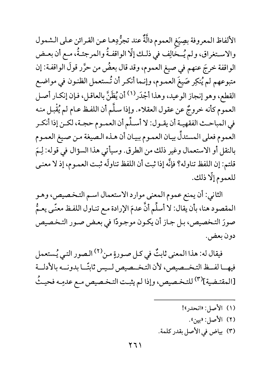 الألفاظ المعروفة بصِيَغِ العموم دالَّةٌ عند تجرُّدِها عن القرائن على الشمول والاستغراق، ولم يُخالِف في ذلك إلّا الواقفةُ والمرجئةُ، مع أن بعض الواقفة خرجَ عنهم في صيغ العموم، وقد قال بعضُ من حرَّر قولَ الواقفة: إن متبوعهم لم يُنكِر صَيغَ العموم، وإنما أنكر أن تُستعمل الظنون في مواضع القطع، وهو إنجاز الوعيد، وهذا أجْدَر (¬١) أن يُظَنَّ بالعاقل، فإن إنكار أصل العموم كأنه خروجٌ عن عقول العقلاء. وإذا سلَّم أن اللفظ عام لم يُقْبل منه في المباحث الفقهية أن يقول: لا أسلِّم أن العموم حجة، لكن إذا أنكر العموم فعلى المستدلِّ بيان العموم ببيان أن هذه الصيغة من صيغ العموم بالنقل أو الاستعمال وغير ذلك من الطرق. وسيأتي هذا السؤال في قوله: لِمَ قلتم: إن اللفظ تناوله؟ فإنَّه إذا ثبت أن اللفظ تناولَه ثبت العموم، إذ لا معنى للعموم إلّا ذلك.