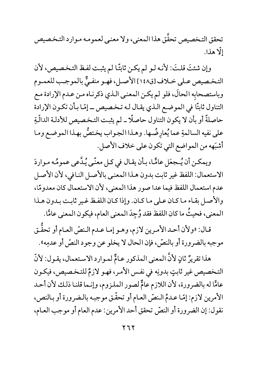هذا تقريرٌ ثانٍ لأنَّ المعنى المذكور عامٌّ لموارد الاستعمال، يقول: لأنّ التخصيص غير ثابتٍ بدونِه في نفس الأمر، فهو لازمٌ للتخصيص، فيكون عامًّا له بالضرورة، لأن اللازم عامٌّ لصور الملزوم، وإنما قلنا ذلك لأن أحد الأمرين لازم: إمّا عدمُ النصّ العام أو تحقّق موجبه بالضرورة أو بالنص، نقول: إن الضرورة أو النصّ تحقق أحد الأمرين: عدم العام أو موجب العام،