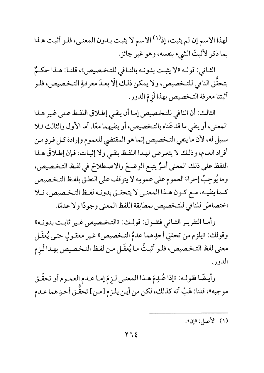 وأما التقرير الثاني فنقول: قولك: «التخصيص غير ثابت بدونه» وقولك: «يلزم من تحققِ أحدِهما عدمُ التخصيص» غير معقولٍ حتى يُعقَل معنى لفظ التخصيص، فلو أثبتَّ ما يُعقَل من لفظ التخصيص بهذا لَزِم الدور.