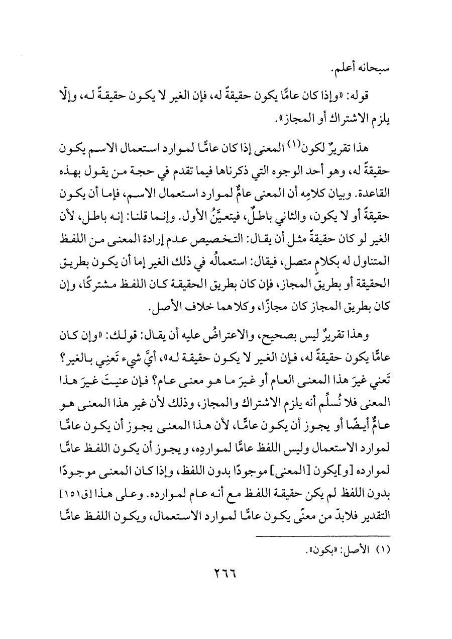 وهذا تقريرٌ ليس بصحيح، والاعتراضُ عليه أن يقال: قولك: «وإن كان عامًّا يكون حقيقةً له، فإن الغير لا يكون حقيقة له»، أيَّ شيء تَعنِي بالغير؟ تَعني غيرَ هذا المعنى العام أو غيرَ ما هو معنى عام؟ فإن عنيتَ غيرَ هذا المعنى فلا نُسلِّم أنه يلزم الاشتراك والمجاز، وذلك لأن غير هذا المعنى هو عامٌّ أيضًا أو يجوز أن يكون عامًّا، لأن هذا المعنى يجوز أن يكون عامًّا لموارد الاستعمال وليس اللفظ عامًّا لمواردِه، ويجوز أن يكون اللفظ عامًّا