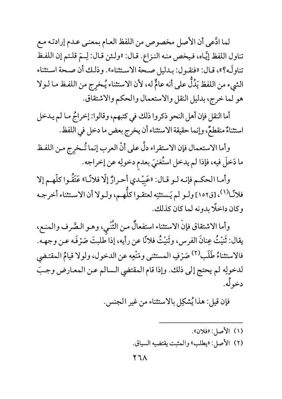 لما ادَّعى أن الأصل مخصوص من اللفظ العام بمعنى عدم إرادته مع تناول اللفظ إيَّاه، فيخص منه النزاع. قال: «ولئن قال: لِمَ قلتم إن اللفظ تناولَه؟»، قال: «فنقول: بدليل صحة الاستثناء». وذلك أن صحة استثناء الشيء من اللفظ يَدُلُّ على أنه عامٌّ له، لأن الاستثناء يُخرِج من اللفظ ما لولا هو لما خرج، بدليل النقل والاستعمال والحكم والاشتقاق.