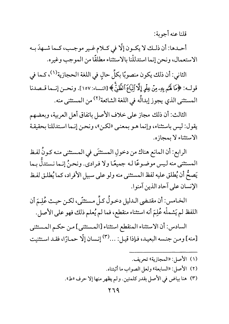 الثالث: أن ذلك مجاز على خلاف الأصل باتفاق أهل العربية، وبعضهم يقول: ليس باستثناء، وإنما هو بمعنى «لكن»، ونحن إنما استدللنا بحقيقة الاستثناء لا بمجازه.