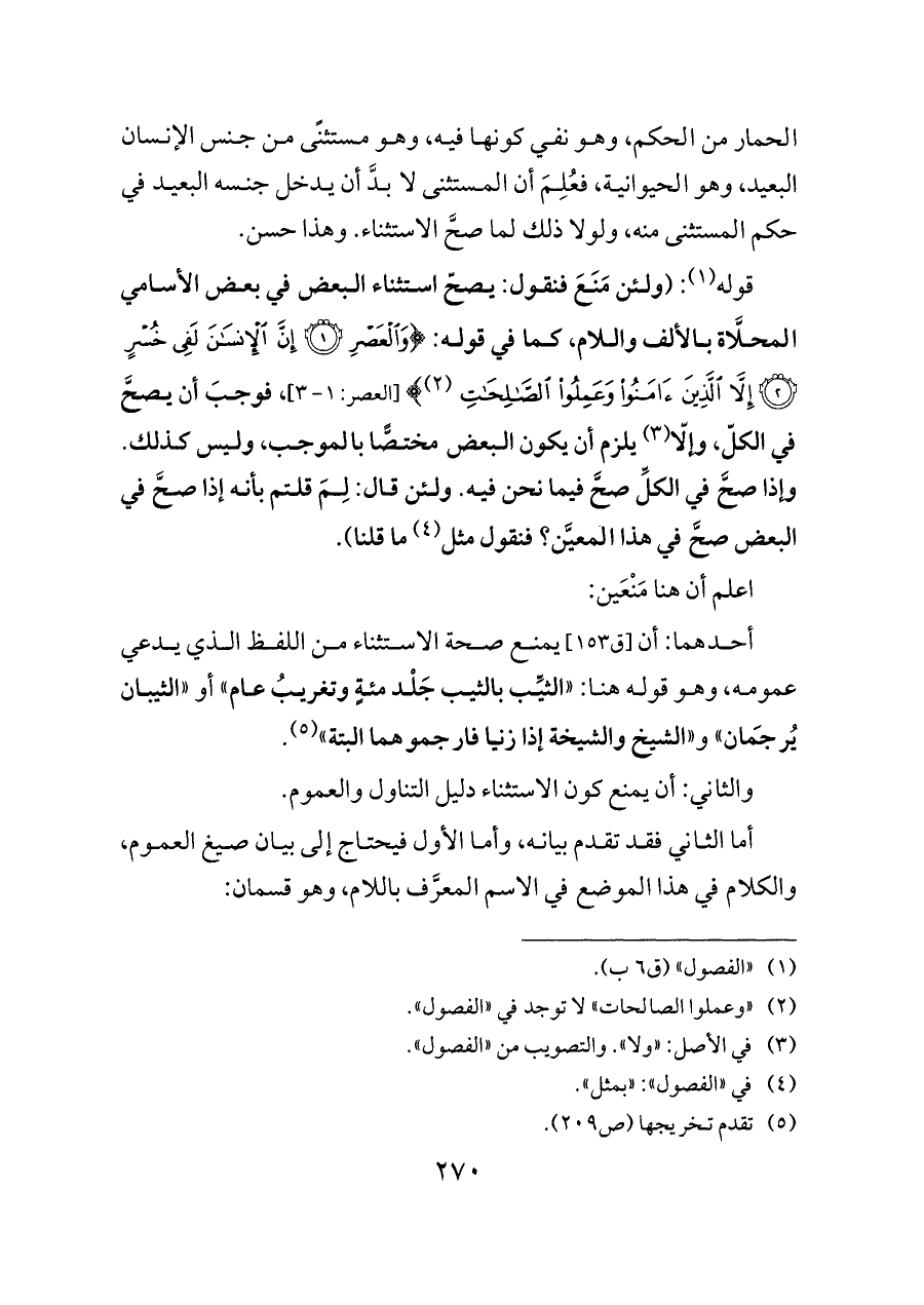 قوله (¬١): (ولئن مَنَعَ فنقول: يصحّ استثناء البعض في بعض الأسامي المحلَّاة بالألف واللام، كما في قوله: {وَالْعَصْرِ (١) إِنَّ الْإِنْسَانَ لَفِي خُسْرٍ (٢) إِلَّا الَّذِينَ آمَنُوا وَعَمِلُوا الصَّالِحَاتِ (¬٢)} [العصر: ١ - ٣]، فوجبَ أن يصحَّ في الكلّ، وإلّا (¬٣) يلزم أن يكون البعض مختصًّا بالموجب، وليس كذلك. وإذا صحَّ في الكلِّ صحَّ فيما نحن فيه. ولئن قال: لِمَ قلتم بأنه إذا صحَّ في البعض صحَّ في هذا المعيَّن؟ فنقول مثل (¬٤) ما قلنا).