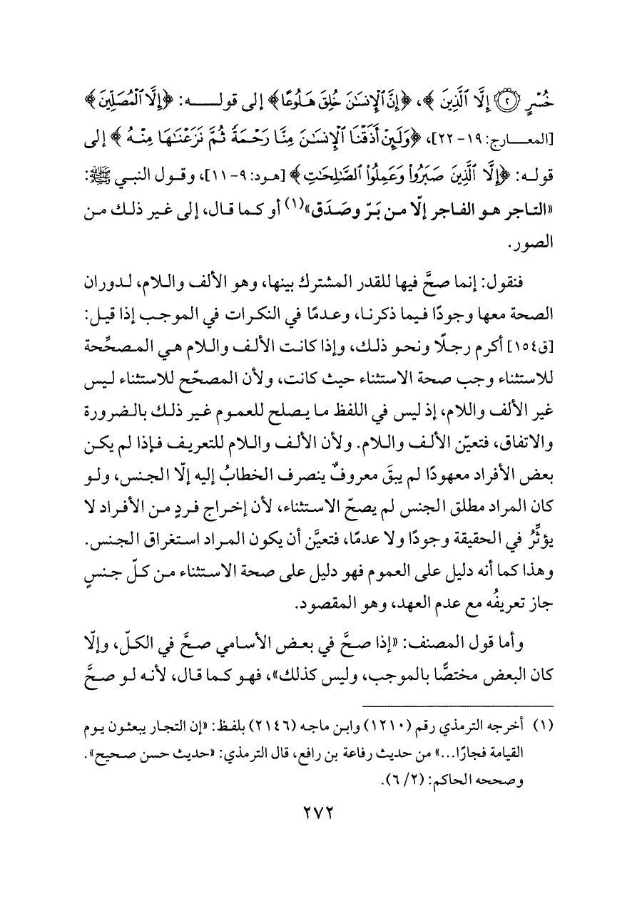 خُسْرٍ (٢) إِلَّا الَّذِينَ}، {إِنَّ الْإِنْسَانَ خُلِقَ هَلُوعًا} إلى قوله: {إِلَّا الْمُصَلِّينَ} [المعارج: ١٩ - ٢٢]، {وَلَئِنْ أَذَقْنَا الْإِنْسَانَ مِنَّا رَحْمَةً ثُمَّ نَزَعْنَاهَا مِنْهُ} إلى قوله: {إِلَّا الَّذِينَ صَبَرُوا وَعَمِلُوا الصَّالِحَاتِ} [هود: ٩ - ١١]، وقول النبي - صلى الله عليه وسلم -: «التاجر هو الفاجر إلّا من بَرّ وصَدَق» (¬١) أو كما قال، إلى غير ذلك من الصور.