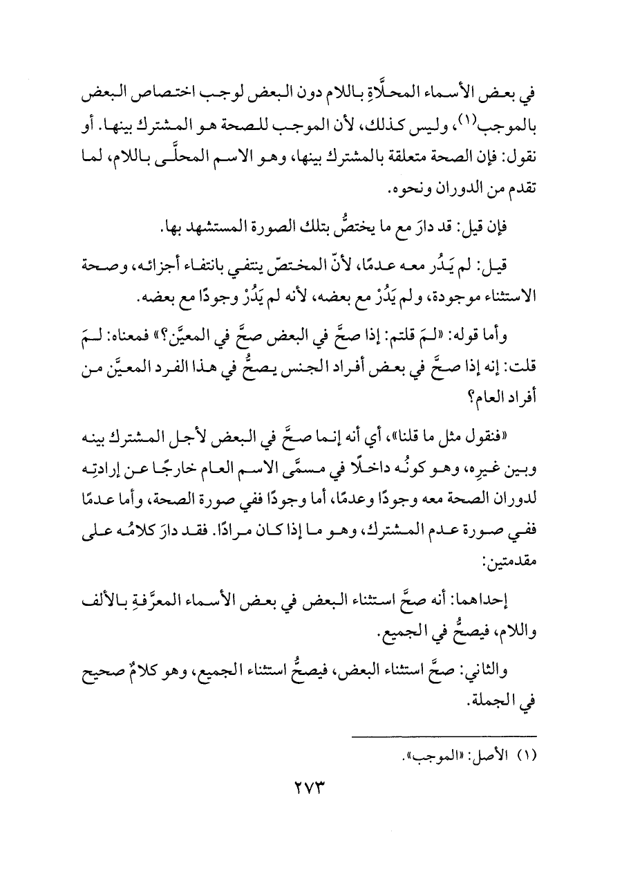 في بعض الأسماء المحلَّاةِ باللام دون البعض لوجب اختصاص البعض بالموجب (¬١)، وليس كذلك، لأن الموجب للصحة هو المشترك بينها. أو نقول: فإن الصحة متعلقة بالمشترك بينها، وهو الاسم المحلَّى باللام، لما تقدم من الدوران ونحوه.