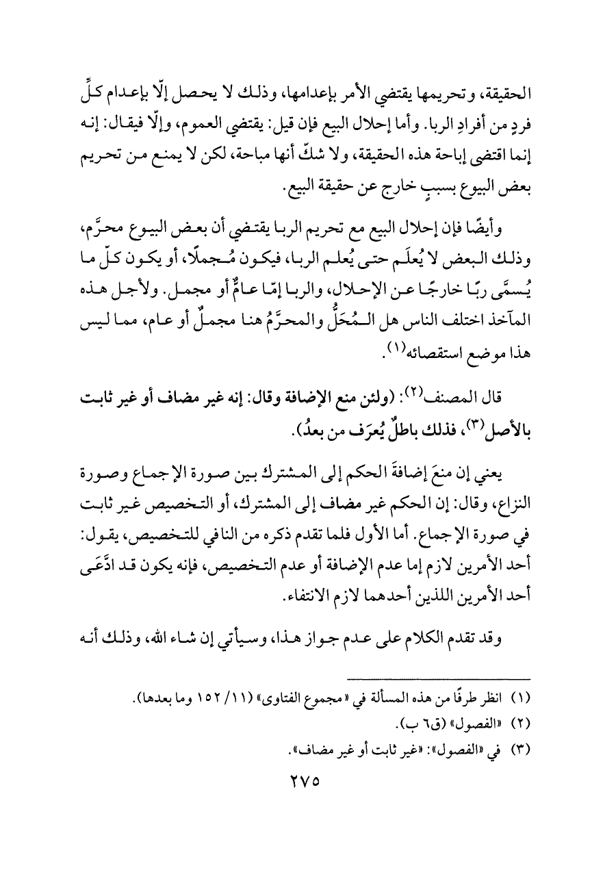 وأيضًا فإن إحلال البيع مع تحريم الربا يقتضي أن بعض البيوع محرَّم، وذلك البعض لا يُعلَم حتى يُعلم الربا، فيكون مُجملًا، أو يكون كلّ ما يُسمَّى ربًا خارجًا عن الإحلال، والربا إمّا عامٌّ أو مجمل. ولأجل هذه المآخذ اختلف الناس هل المُحَلُّ والمحرَّمُ هنا مجملٌ أو عام، مما ليس هذا موضع استقصائه (¬١).