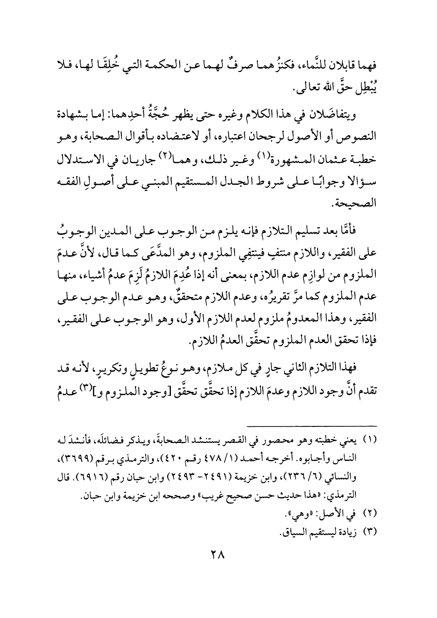 ويتفاضَلان في هذا الكلام وغيره حتى يظهر حُجَّةُ أحدِهما: إما بشهادة النصوص أو الأصول لرجحان اعتباره، أو لاعتضاده بأقوال الصحابة، وهو خطبة عثمان المشهورة (¬١) وغير ذلك، وهما (¬٢) جاريان في الاستدلال سؤالا وجوابًا على شروط الجدل المستقيم المبني على أصولِ الفقه الصحيحة.