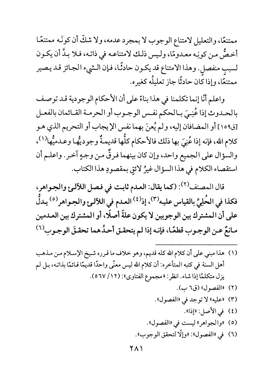 واعلم أنّا إنما تكلمنا في هذا بناءً على أن الأحكام الوجودية قد توصف بالحدوث إذا عُنِيَ بالحكم نفس الوجوب أو الحرمة القائمان بالفعل [ق ١٥٩] أو المضافان إليه، ولم يُعنَ بهما نفس الإيجاب أو التحريم الذي هو كلام الله، فإنه إذا عُنِيَ بها ذلك فالأحكام كلُّها قديمةٌ وجوديُّها وعدميُّها (¬١)، والسؤال على الجميع واحد، وإن كان بينهما فرقٌ من وجهٍ آخر. واعلم أن استقصاء الكلام في هذا السؤال غيرُ لائقٍ بمقصودِ هذا الكتاب.