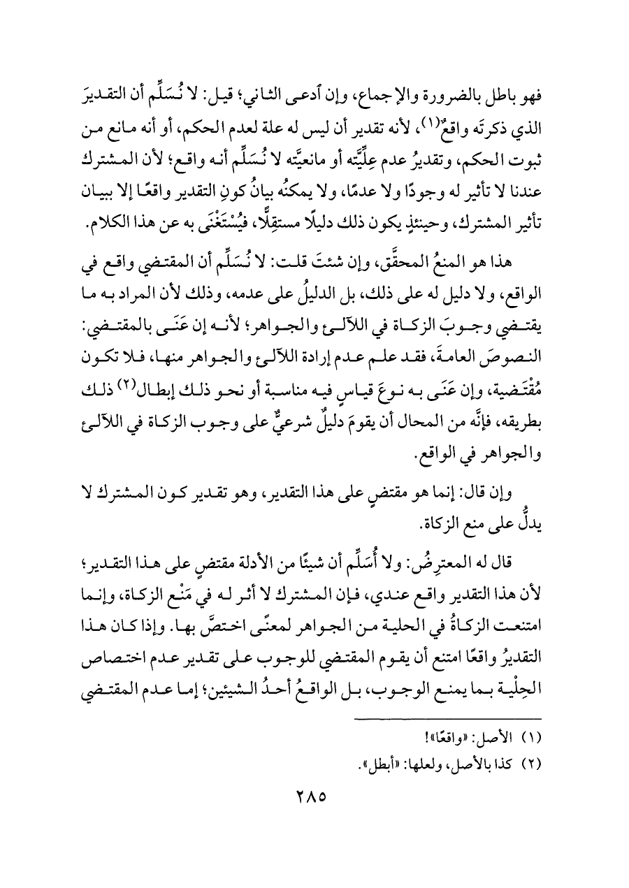 قال له المعترِضُ: ولا أُسَلِّم أن شيئًا من الأدلة مقتضٍ على هذا التقدير؛ لأن هذا التقدير واقع عندي، فإن المشترك لا أثر له في مَنْع الزكاة، وإنما امتنعت الزكاةُ في الحلية من الجواهر لمعنًى اختصَّ بها. وإذا كان هذا التقديرُ واقعًا امتنع أن يقوم المقتضي للوجوب على تقدير عدم اختصاص الحِلْية بما يمنع الوجوب، بل الواقعُ أحدُ الشيئين؛ إما عدم المقتضي