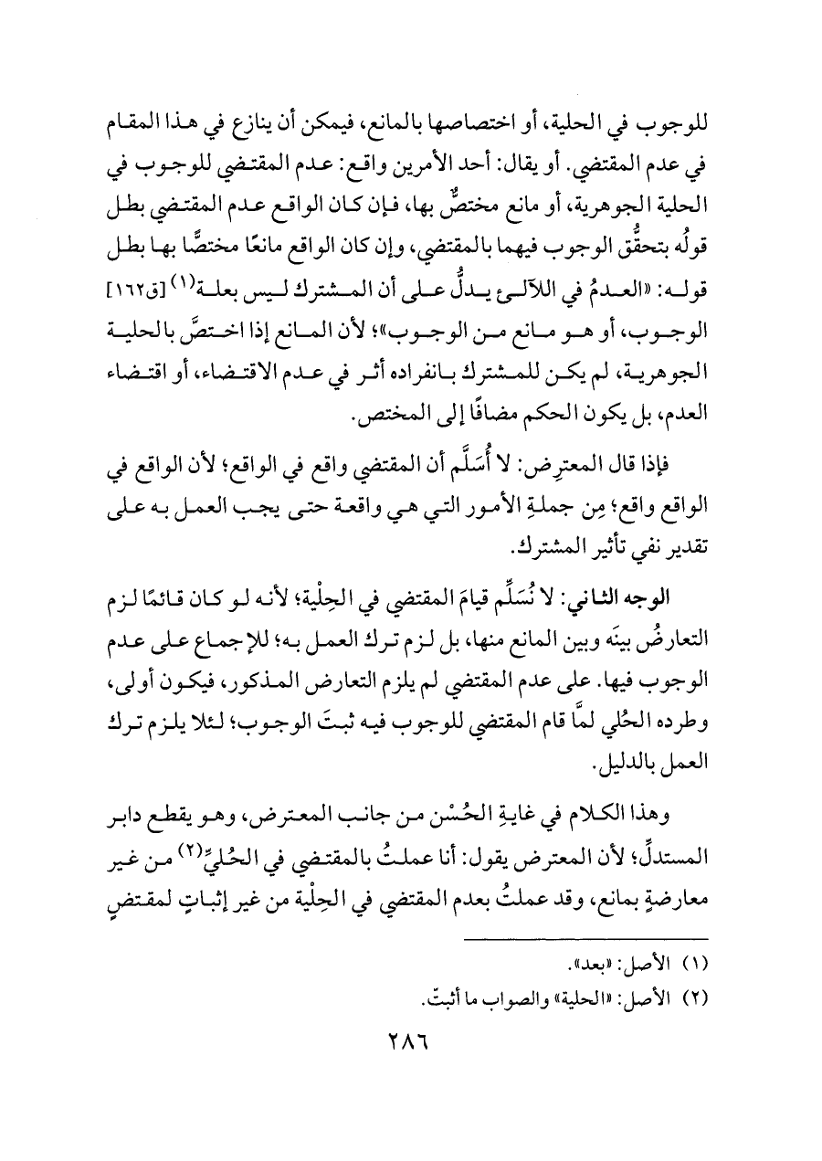 الوجه الثاني: لا نُسَلِّم قيامَ المقتضي في الحِلْية؛ لأنه لو كان قائمًا لزم التعارضُ بينَه وبين المانع منها، بل لزم ترك العمل به؛ للإجماع على عدم الوجوب فيها. على عدم المقتضي لم يلزم التعارض المذكور، فيكون أولى، وطرده الحُلي لمَّا قام المقتضي للوجوب فيه ثبتَ الوجوب؛ لئلا يلزم ترك العمل بالدليل.