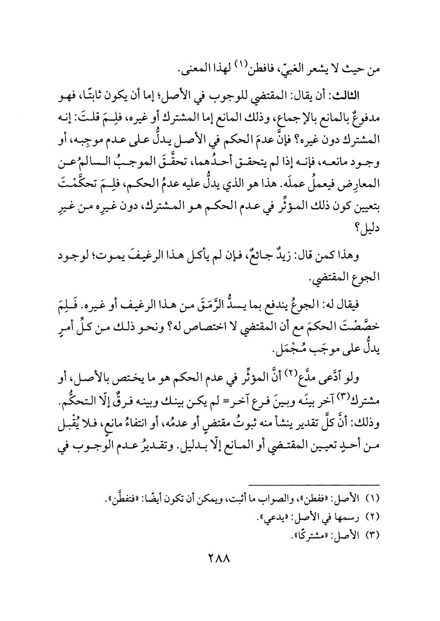 الثالث: أن يقال: المقتضي للوجوب في الأصل؛ إما أن يكون ثابتًا، فهو مدفوعٌ بالمانع بالإجماع، وذلك المانع إما المشترك أو غيره، فلِمَ قلتَ: إنه المشترك دون غيره؟ فإنَّ عدمَ الحكم في الأصل يدلُّ على عدم موجِبه، أو وجود مانعه، فإنه إذا لم يتحقق أحدُهما، تحقَّقَ الموجبُ السالمُ عن المعارِض فيعملُ عملَه. هذا هو الذي يدلُّ عليه عدمُ الحكم، فلِمَ تحكَّمْتَ بتعيين كون ذلك المؤثِّر في عدم الحكم هو المشترك، دون غيرِه من غيرِ دليل؟
