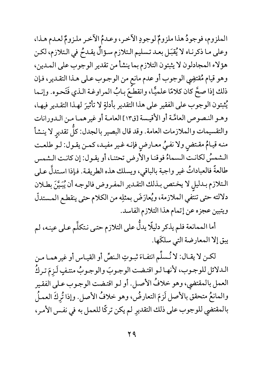 الملزوم، فوجودُ هذا ملزومٌ لوجودِ الآخر، وعدمُ الآخر ملزومٌ لعدم هذا، وعلى ما ذكرناه لا يُقبَل بعد تسليم التلازم سؤالٌ يقدحُ في التلازم، لكن هؤلاء المجادلون لا يثبتون التلازم بما ينشأ من تقدير الوجوب على المدين، وهو قيام مُقتضِي الوجوب أو عدم مانعٍ من الوجوب على هذا التقدير، فإن ذلك إذا صحَّ كان كلامًا علميًّا، وانقطعَ بابُ المراوغة الذي فَتَحوه. وإنما يُثبتون الوجوب على الفقير على هذا التقدير بأدلةٍ لا تأثيرَ لهذا التقدير فيها، وهو النصوص العامَّة أو الأقيسة [ق ١٣] العامة أو غيرهما من الدورانات والتقسيمات والملازمات العامة. وقد قال البصير بالجدل: كلُّ تقديرٍ لا ينشأ منه قيامُ مقتضٍ ولا نفيُ معارضٍ فإنه غير مفيد، كمن يقول: لو طلعت الشمسُ لكانت السماءُ فوقنا والأرض تحتنا، أو يقول: إن كانت الشمس طالعةً فالعباداتُ غير واجبة بالباقي، ويسلك هذه الطريقة. فإذا استدلَّ على التلازم بدليلٍ لا يختص بذلك التقدير المفروض فالوجه أن يُبَيَّنَ بطلان دلالته حتى تنتفي الملازمة، ويُعارَضَ بمثلِه من الكلام حتى ينقطع المستدلّ ويتبين عجزه عن إتمام هذا التلازم الفاسد.