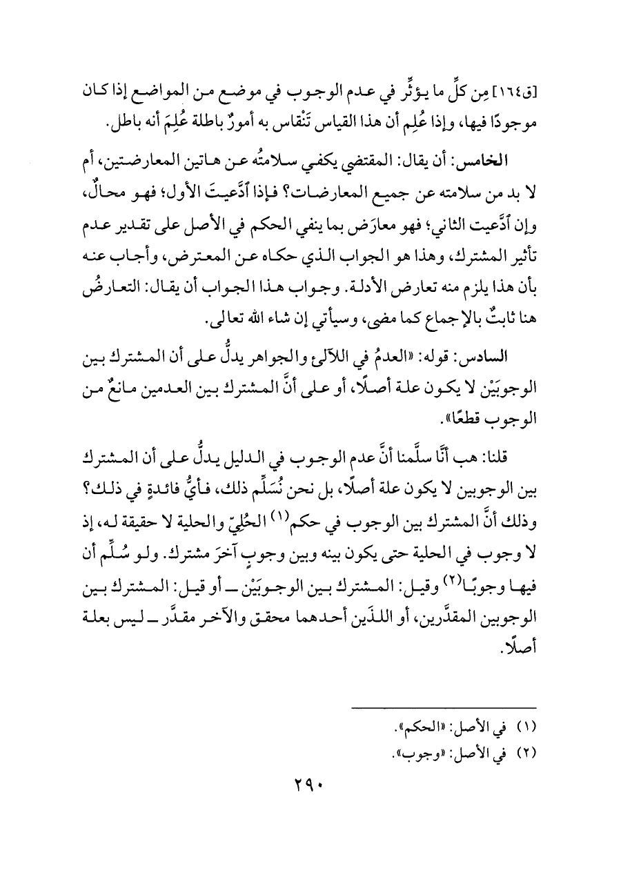 السادس: قوله: «العدمُ في اللآلئ والجواهر يدلُّ على أن المشترك بين الوجوبَيْن لا يكون علة أصلًا، أو على أنَّ المشترك بين العدمين مانعٌ من الوجوب قطعًا».
