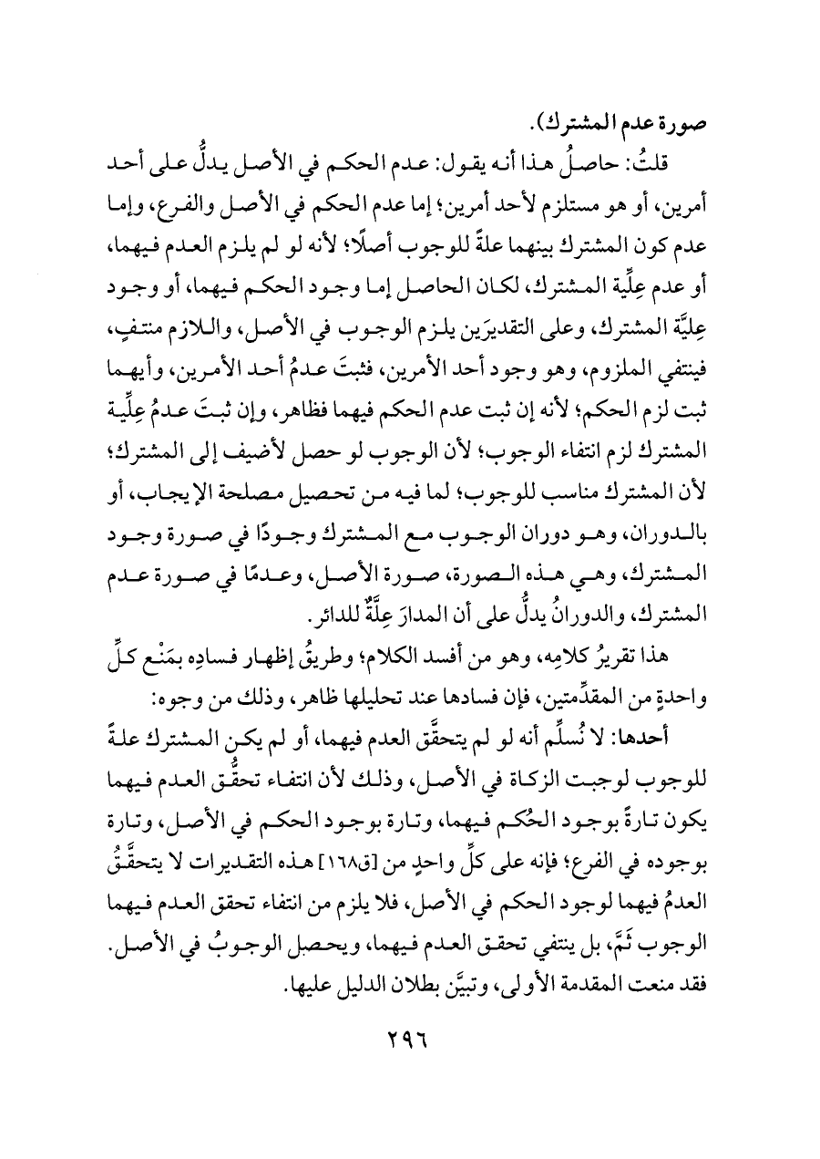 أحدها: لا نُسلِّم أنه لو لم يتحقَّق العدم فيهما، أو لم يكن المشترك علةً للوجوب لوجبت الزكاة في الأصل، وذلك لأن انتفاء تحقُّق العدم فيهما يكون تارةً بوجود الحُكم فيهما، وتارة بوجود الحكم في الأصل، وتارة بوجوده في الفرع؛ فإنه على كلِّ واحدٍ من [ق ١٦٨] هذه التقديرات لا يتحقَّقُ العدمُ فيهما لوجود الحكم في الأصل، فلا يلزم من انتفاء تحقق العدم فيهما الوجوب ثَمَّ، بل ينتفي تحقق العدم فيهما، ويحصل الوجوبُ في الأصل. فقد منعت المقدمة الأولى، وتبيَّن بطلان الدليل عليها.