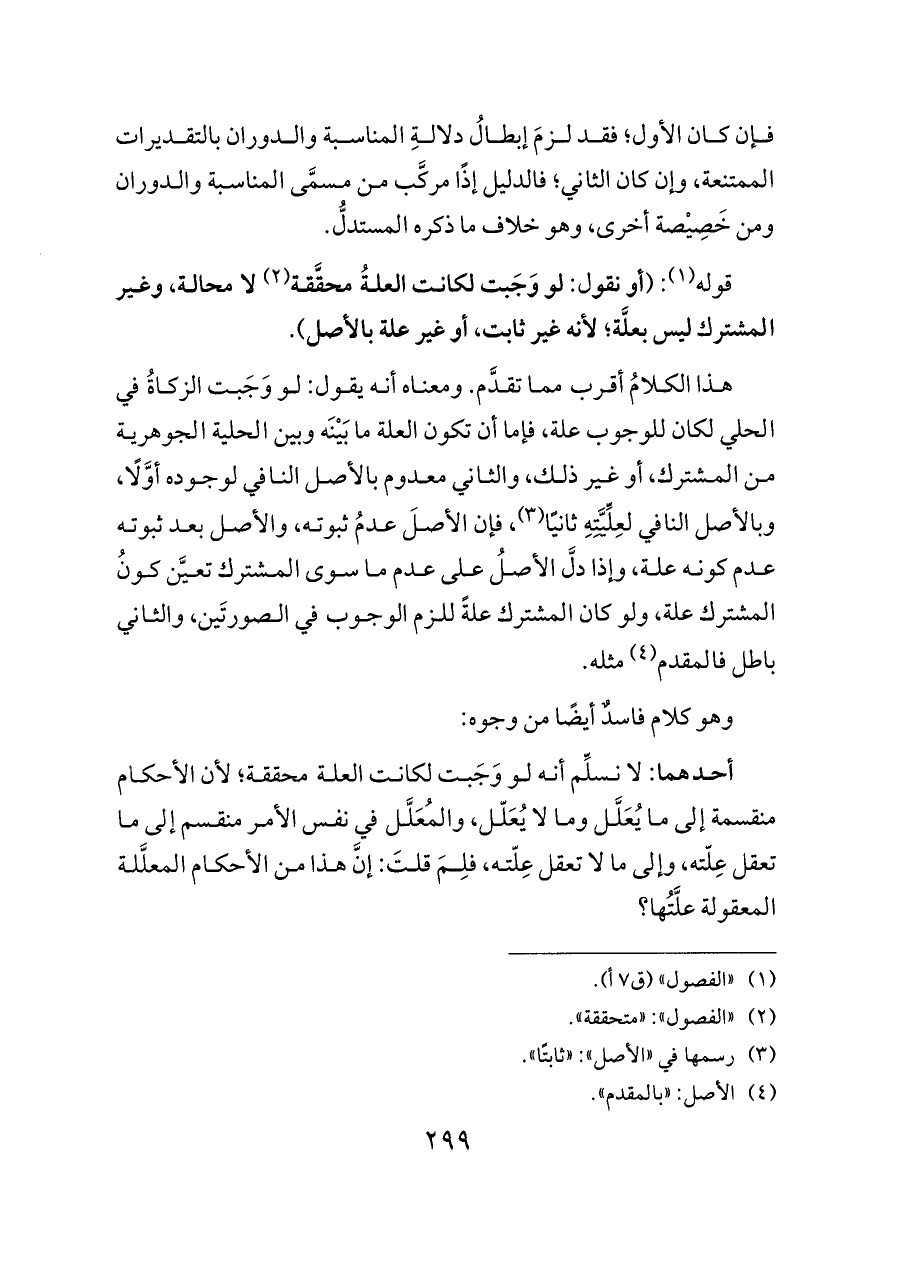 هذا الكلامُ أقرب مما تقدَّم. ومعناه أنه يقول: لو وَجَبت الزكاةُ في الحلي لكان للوجوب علة، فإما أن تكون العلة ما بَيْنَه وبين الحلية الجوهرية من المشترك، أو غير ذلك، والثاني معدوم بالأصل النافي لوجوده أوَّلًا، وبالأصل النافي لعِلِّيَّتِهِ ثانيًا (¬٣)، فإن الأصلَ عدمُ ثبوته، والأصل بعد ثبوته عدم كونه علة، وإذا دلَّ الأصلُ على عدم ما سوى المشترك تعيَّن كونُ المشترك علة، ولو كان المشترك علةً للزم الوجوب في الصورتَين، والثاني باطل فالمقدم (¬٤) مثله.
