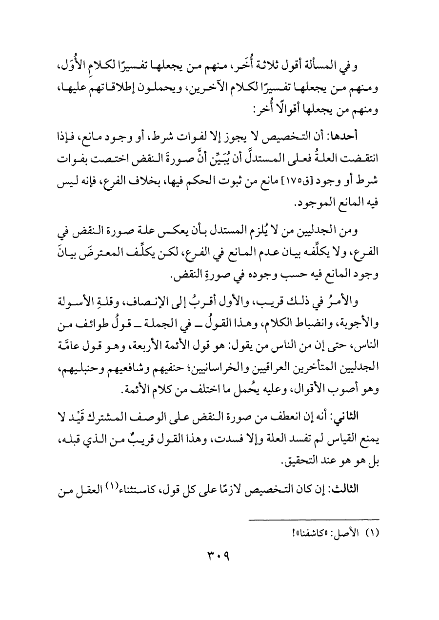 والأمرُ في ذلك قريب، والأول أقربُ إلى الإنصاف، وقلةِ الأسولة والأجوبة، وانضباط الكلام، وهذا القولُ ــ في الجملة ــ قولُ طوائف من الناس، حتى إن من الناس من يقول: هو قول الأئمة الأربعة، وهو قول عامَّة الجدليين المتأخرين العراقيين والخراسانيين؛ حنفيهم وشافعيهم وحنبليهم، وهو أصوب الأقوال، وعليه يُحمل ما اختلف من كلام الأئمة.