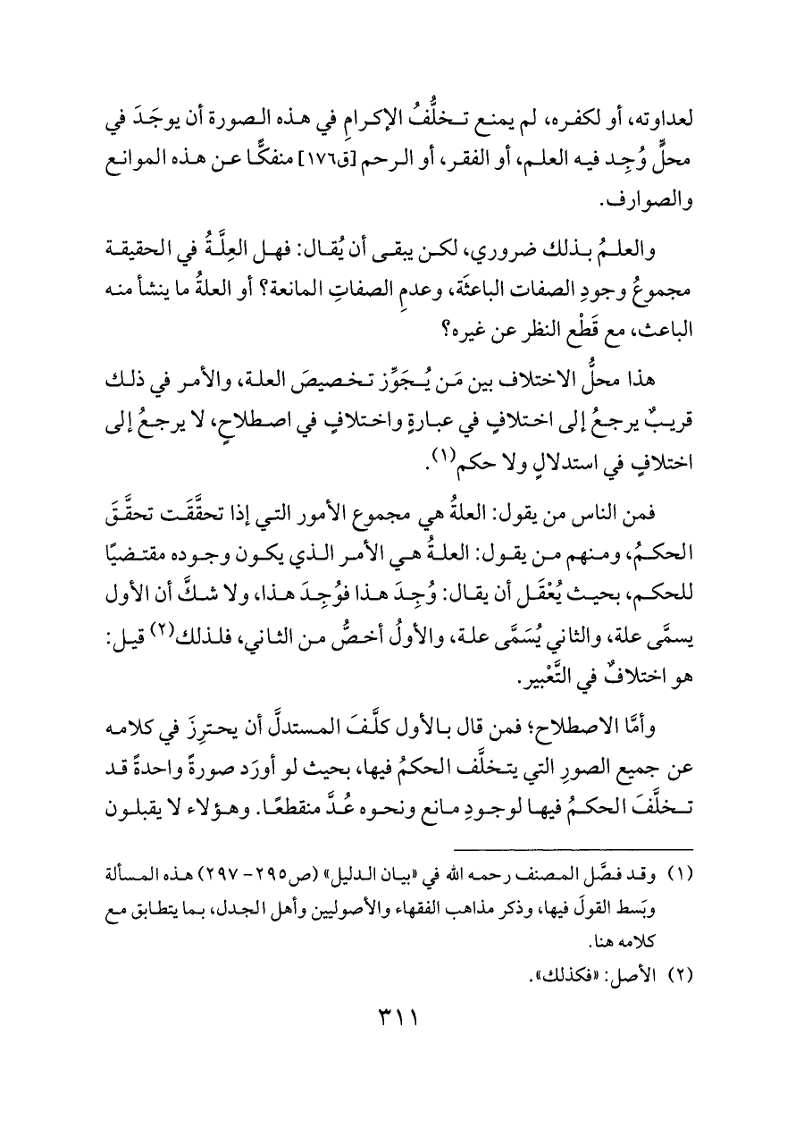 والعلمُ بذلك ضروري، لكن يبقى أن يُقال: فهل العِلَّةُ في الحقيقة مجموعُ وجودِ الصفات الباعثَة، وعدمِ الصفاتِ المانعة؟ أو العلةُ ما ينشأ منه الباعث، مع قَطْع النظر عن غيره؟