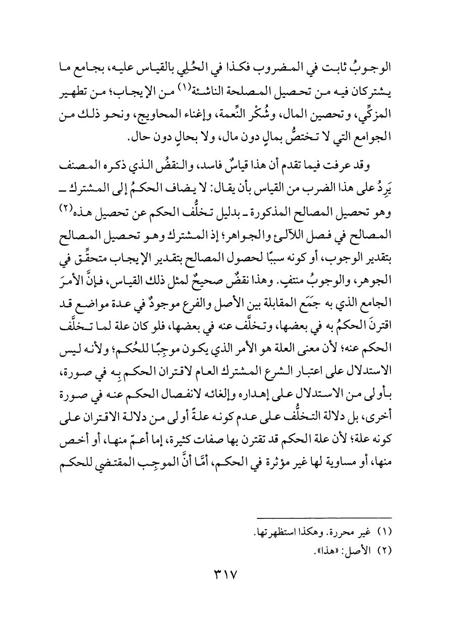 وقد عرفت فيما تقدم أن هذا قياسٌ فاسد، والنقضُ الذي ذكره المصنف يَرِدُ على هذا الضرب من القياس بأن يقال: لا يضاف الحكمُ إلى المشترك ــ وهو تحصيل المصالح المذكورة ــ بدليل تخلُّف الحكم عن تحصيل هذه (¬٢) المصالح في فصل اللآلئ والجواهر؛ إذ المشترك وهو تحصيل المصالح بتقدير الوجوب، أو كونه سببًا لحصول المصالح بتقدير الإيجاب متحقِّق في الجوهر، والوجوبُ منتفٍ. وهذا نقضٌ صحيحٌ لمثل ذلك القياس، فإنَّ الأمرَ الجامع الذي به جَمَع المقابلة بين الأصل والفرع موجودٌ في عدة مواضع قد اقترنَ الحكمُ به في بعضها، وتخلَّف عنه في بعضها، فلو كان علة لما تخلَّف الحكم عنه؛ لأن معنى العلة هو الأمر الذي يكون موجِبًا للحُكم؛ ولأنه ليس الاستدلال على اعتبار الشرع المشترك العام لاقتران الحكم بِه في صورة، بأولى من الاستدلال على إهداره وإلغائه لانفصال الحكم عنه في صورة أخرى، بل دلالة التخلُّف على عدم كونه علةً أولى من دلالة الاقتران على كونه علة؛ لأن علة الحكم قد تقترن بها صفات كثيرة، إما أعمّ منها، أو أخص منها، أو مساوية لها غير مؤثرة في الحكم، أمَّا أنَّ الموجِب المقتضي للحكم