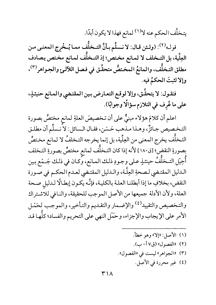 اعلم أن كلامَ هؤلاء مبنيٌّ على أن تخصيصَ العلةِ لمانعٍ مختصٍّ بصورة التخصيص جائزٌ، وهذا مذهب حَسَن، فقال السائل: لا نسلِّم أن مطلق التخلُّف يخرج المعنى من العِلِّية، بل إنما يخرجه التخلفُ لا لمانع مختصٍّ بصورةِ النقض؛ [ق ١٨٠] لأنه إذا كان التخلُّف لمانعٍ مختصٍّ بصورةِ التخلف أُحِيْل التخلُّفُ حينئذٍ على وجودِ ذلك المانع، وكان في ذلك جَمْع بين الدليل المقتضي لصحةِ العِلَّة، والدليل المقتضي لعدم الحكم في صورة النقض، بخلافِ ما إذا أبطلنا العلة بالكلية، فإنَّه يكون إبطالًا لدليلِ صحة العلة، ولأن الأدلة جميعها من الأصل الموجب للحقيقة، والنافي للاشتراك والتخصيص والتقييد (¬٤) والإضمار والتقديم والتأخير، والموجب لحَمْل الأمر على الإيجاب والإجزاء، وحَمْل النهي على التحريم والفساد؛ كلُّها قد