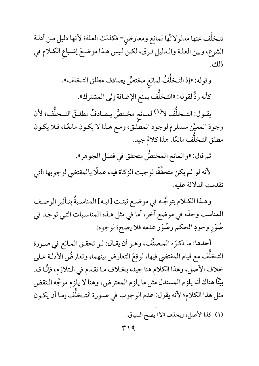 يقول: التخلُّف لا (¬١) لمانعٍ مختصٍّ يصادفُ مطلقَ التخلُّف؛ لأن وجودَ المعيَّن مستلزم لوجود المطلق، ومع هذا لا يكون مانعًا، فلا يكون مطلق التخلُّف مانعًا. هذا كلامٌ جيد.