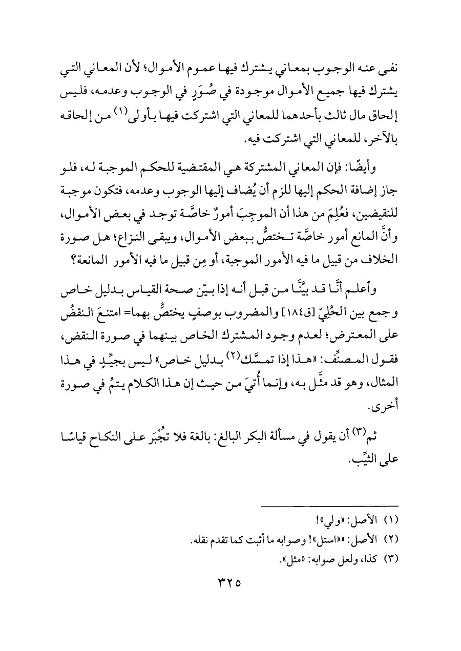 وأيضًا: فإن المعاني المشتركة هي المقتضية للحكم الموجبة له، فلو جاز إضافة الحكم إليها للزم أن يُضاف إليها الوجوب وعدمه، فتكون موجبة للنقيضين، فعُلِمَ من هذا أن الموجِبَ أمورٌ خاصَّة توجد في بعض الأموال، وأنَّ المانع أمور خاصَّة تختصُّ ببعض الأموال، ويبقى النزاع؛ هل صورة الخلاف من قبيل ما فيه الأمور الموجبة، أو مِن قبيل ما فيه الأمور المانعة؟