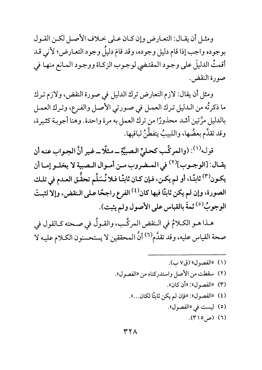 هذا هو الكلامُ في النقض المركَّب، والقولُ في صحته كالقول في صحة القياس عليه، وقد تقدَّم (¬٦) أنَّ المحققين لا يستحسنون الكلام عليه لا
