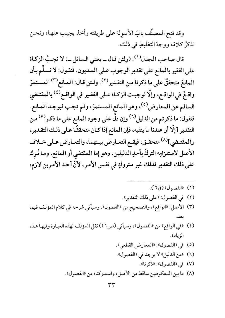 قال صاحب الجدل (¬١): (ولئن قال ــ يعني السائل ــ: لا تجبُ الزكاة على الفقير بالمانع على تقدير الوجوب على المديون. فنقول: لا نسلِّم بأن المانعَ متحققٌ على ما ذكرنا من التقدير (¬٢). ولئن قال: المانع (¬٣) المستمرّ واقعٌ في الواقع، وإلّا لوجبت الزكاة على الفقير في الواقع (¬٤) بالمقتضي السالم عن المعارض (¬٥)، وهو المانع المستمرّ، ولم تجب فيوجد المانع. فنقول: ما ذكرتم من الدليل (¬٦) وإن دلَّ على وجود المانع على ما ذكر (¬٧) من التقدير [إلّا أن عندنا ما ينفيه، فإن المانع إذا كان متحققًا على ذلك التقدير، والمقتضي] (¬٨) متحقق، فيقع التعارض بينهما، والتعارض على خلاف الأصل لاستلزامِه التركَ بأحدِ الدليلين، وهو إما المقتضي أو المانع، وما تُرِك على ذلك التقدير فذلك غير متروكٍ في نفس الأمر، لأنّ أحد الأمرين لازم،