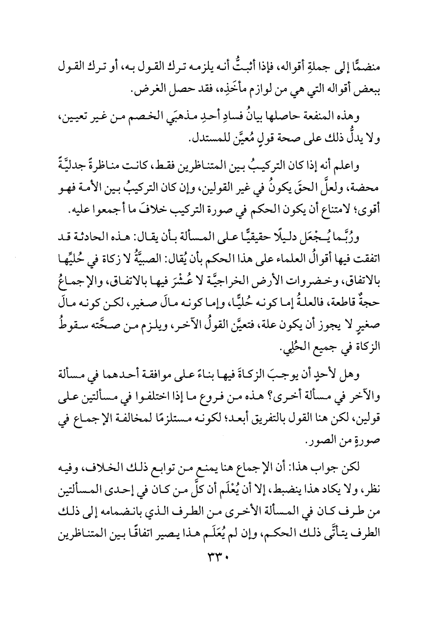واعلم أنه إذا كان التركيبُ بين المتناظرين فقط، كانت مناظرةً جدليَّةً محضة، ولعلَّ الحقَ يكونُ في غير القولين، وإن كان التركيبُ بين الأمة فهو أقوى؛ لامتناع أن يكون الحكم في صورة التركيب خلافَ ما أجمعوا عليه.