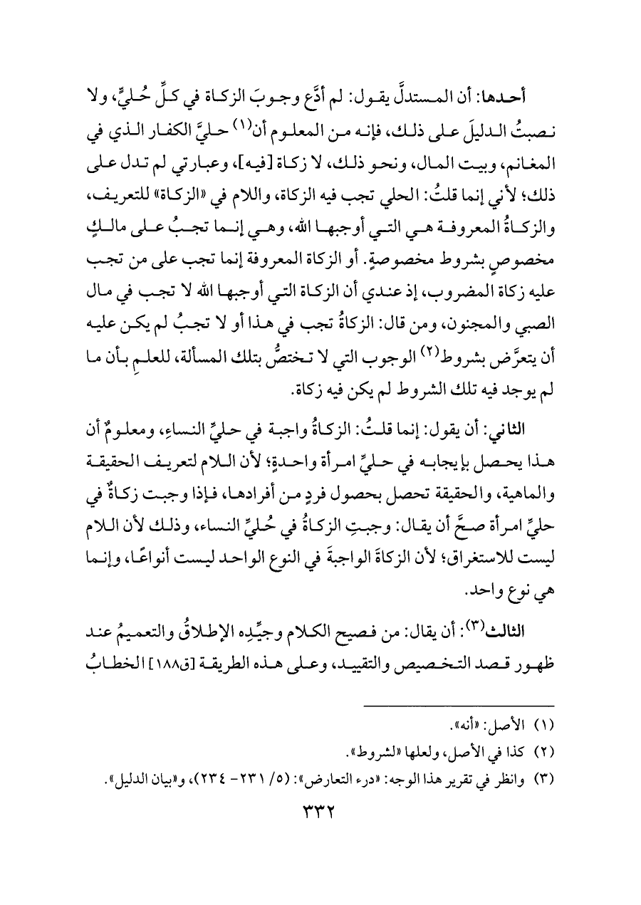 أحدها: أن المستدلَّ يقول: لم أدَّع وجوبَ الزكاة في كلِّ حُليٍّ، ولا نصبتُ الدليلَ على ذلك، فإنه من المعلوم أن (¬١) حليَّ الكفار الذي في المغانم، وبيت المال، ونحو ذلك، لا زكاة [فيه]، وعبارتي لم تدل على ذلك؛ لأني إنما قلتُ: الحلي تجب فيه الزكاة، واللام في «الزكاة» للتعريف، والزكاةُ المعروفة هي التي أوجبها الله، وهي إنما تجبُ على مالكٍ مخصوصٍ بشروط مخصوصةٍ. أو الزكاة المعروفة إنما تجب على من تجب عليه زكاة المضروب، إذ عندي أن الزكاة التي أوجبها الله لا تجب في مال الصبي والمجنون، ومن قال: الزكاةُ تجب في هذا أو لا تجبُ لم يكن عليه أن يتعرَّض بشروط (¬٢) الوجوب التي لا تختصُّ بتلك المسألة، للعلمِ بأن ما لم يوجد فيه تلك الشروط لم يكن فيه زكاة.