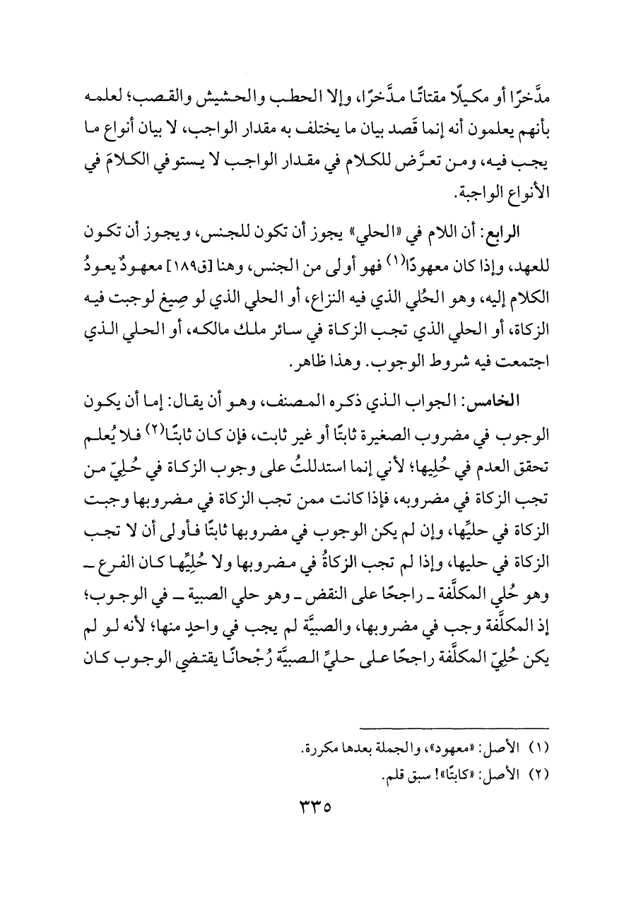 الرابع: أن اللام في «الحلي» يجوز أن تكون للجنس، ويجوز أن تكون للعهد، وإذا كان معهودًا (¬١) فهو أولى من الجنس، وهنا [ق ١٨٩] معهودٌ يعودُ الكلام إليه، وهو الحُلي الذي فيه النزاع، أو الحلي الذي لو صِيغ لوجبت فيه الزكاة، أو الحلي الذي تجب الزكاة في سائر ملك مالكه، أو الحلي الذي اجتمعت فيه شروط الوجوب. وهذا ظاهر.