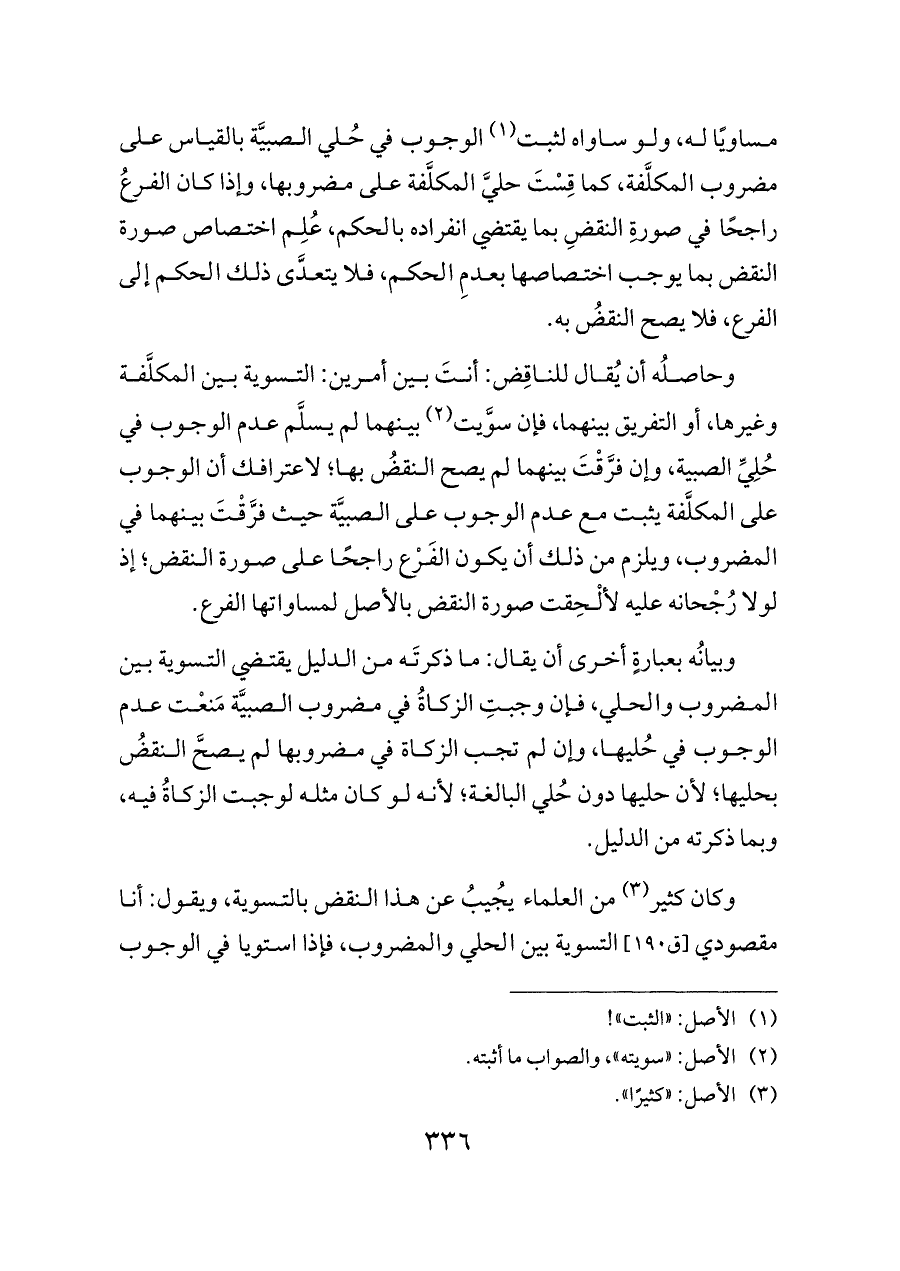 وكان كثير (¬٣) من العلماء يُجيبُ عن هذا النقض بالتسوية، ويقول: أنا مقصودي [ق ١٩٠] التسوية بين الحلي والمضروب، فإذا استويا في الوجوب