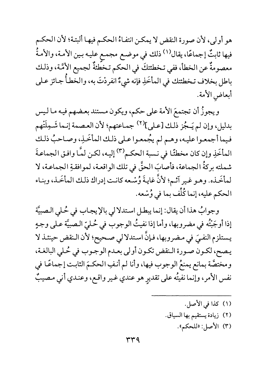 وجوابُ هذا أن يقال: إنما يبطل استدلالي بالإيجاب في حُلي الصبيَّة إذا أوجَبْتُه في مضروبها، وأما إذا نفيتُ الوجوب في حُليّ الصبيَّة على وجهٍ يستلزم النفيَ في مضروبها، فإنَّ استدلالي صحيح؛ لأن النقض حينئذ لا يصح، لكون صورة النقض تكون أولى بعدم الوجوب في حُلي البالغة، ومختصَّة بمانع يمنعُ الوجوب فيها، وأنا لم أنفِ الحكمَ الثابت إجماعًا في نفس الأمر، وإنما نفيتُه على تقديرٍ هو عندي غير واقع، وعندي أني مصيبٌ