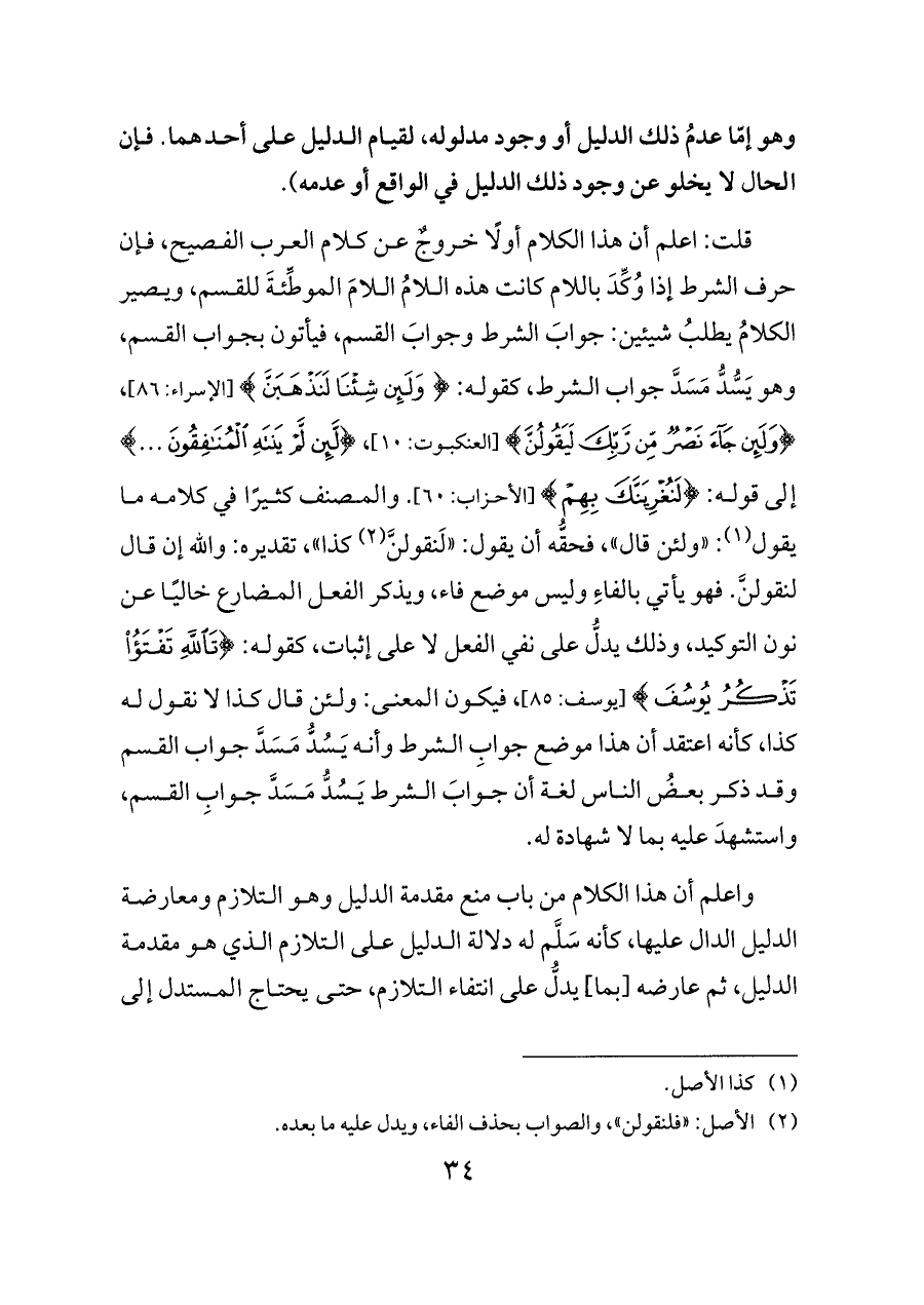 واعلم أن هذا الكلام من باب منع مقدمة الدليل وهو التلازم ومعارضة الدليل الدال عليها، كأنه سَلَّم له دلالة الدليل على التلازم الذي هو مقدمة الدليل، ثم عارضه [بما] يدلُّ على انتفاء التلازم، حتى يحتاج المستدل إلى