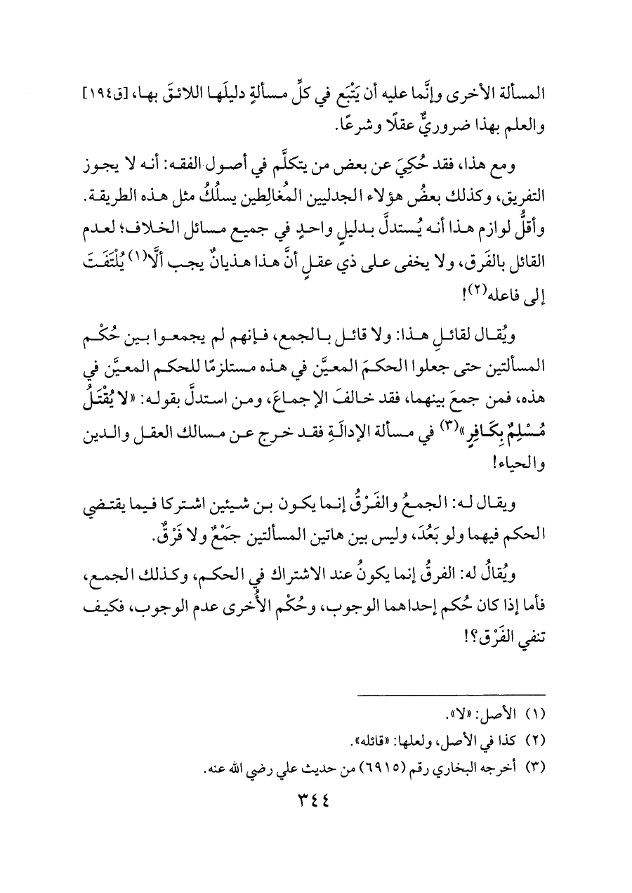 المسألة الأخرى وإنَّما عليه أن يَتْبَع في كلِّ مسألةٍ دليلَها اللائقَ بها، [ق ١٩٤] والعلم بهذا ضروريٌّ عقلًا وشرعًا.