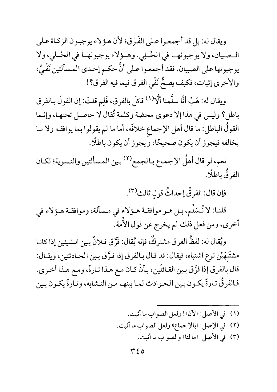 ويقال له: بل قد أجمعوا على الفَرْق؛ لأن هؤلاء يوجبون الزكاة على الصبيان، ولا يوجبونها في الحُلِي. وهؤلاء يوجبونها في الحُلي، ولا يوجبونها على الصبيان. فقد أجمعوا على أنَّ حكم إحدى المسألتين نَفْيٌ، والأخرى إثبات، فكيف يصحُّ نَفْي الفرق فيما فيه الفرق؟!