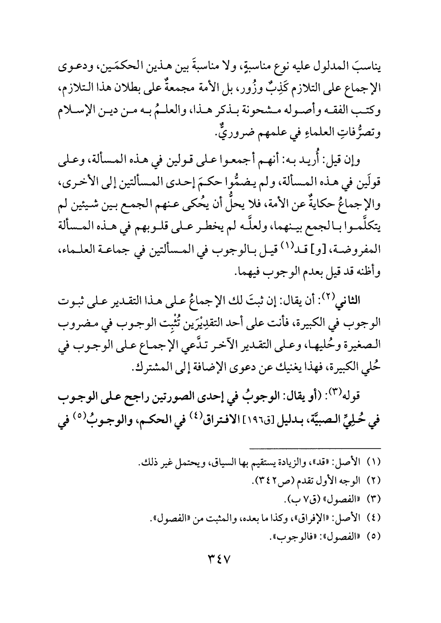 وإن قيل: أُريد به: أنهم أجمعوا على قولين في هذه المسألة، وعلى قولَين في هذه المسألة، ولم يضمُّوا حكمَ إحدى المسألتين إلى الأخرى، والإجماعُ حكايةٌ عن الأمة، فلا يحلُّ أن يُحكى عنهم الجمع بين شيئين لم يتكلَّموا بالجمع بينهما، ولعلَّه لم يخطر على قلوبهم في هذه المسألة المفروضة، [و] قد (¬١) قيل بالوجوب في المسألتين في جماعة العلماء، وأظنه قد قيل بعدم الوجوب فيهما.